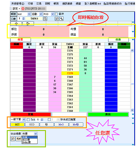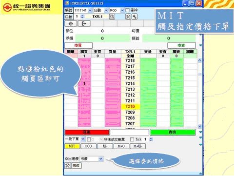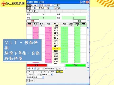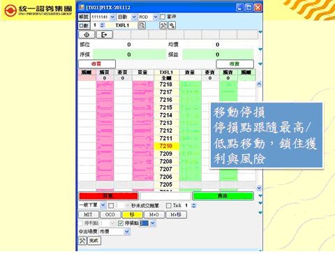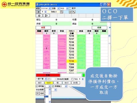 注意事項,請詳閱 1. 智慧單功能之預掛單價位及條件,乃由交易人自行設定,請斟酌風險承受度及資金之管控,留意該設定條件是否合宜! 2. 在交易極為活絡情況下,撮合之價格上下變動可能會相當迅速,投資人所委託之停損及移動停損單在被市場成交價觸及時,系統可能無法立即判別執行或延遲執行。 3. 本公司所提供之即時報價資訊,不代表勸誘投資人進行期貨交易,且不保證此資料之正確性及完整性。 4. 使用本公司的電子下單系統交易委託買賣,仍可能面臨斷線、斷電、網路壅塞等阻礙,致使委託買賣無法傳送或接收或時間延遲。 5. 任何系統參數須由投資人自行設定。 6. 期貨及選擇權交易具低保證金之高度財務槓桿特性,在可能產生極大利潤的同時也可能產生極大的損失,投資人於開戶前應審慎考慮本身的財務能力及經濟狀況。 7. 交易系統會受資訊源及電腦穩定度之影響。投資人仍應獨立判斷及行使交易決定,所有交易衍生之風險及利益,由投資人自行負擔與享有。 8. 使用多次IOC觸價下單功能以及任何多功能智慧單必須在您電腦及交易軟體開啟運作正常下且網路連線正常才有效,反之關閉以及當機或斷線則無效。