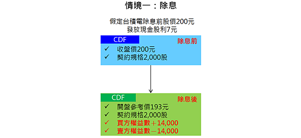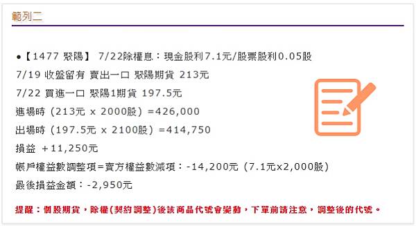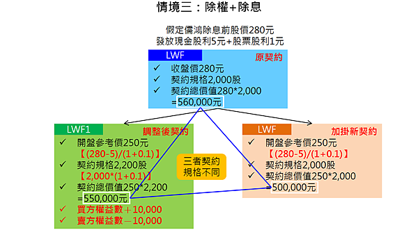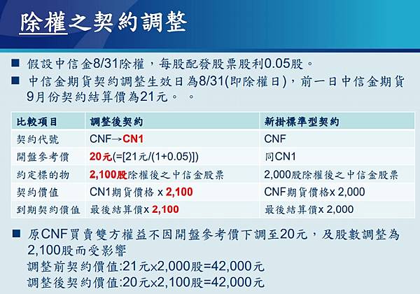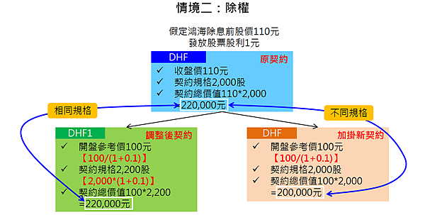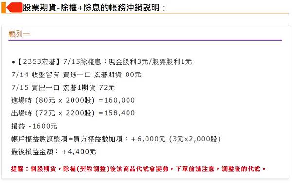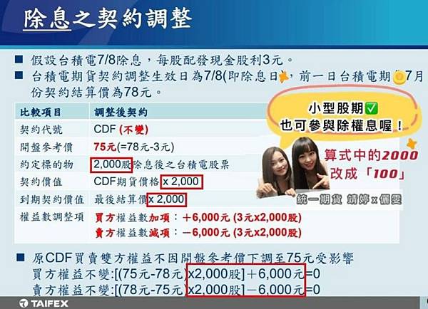 我們先為同學整理好交易股票期貨的四大優勢: 利用股票期貨參與除權息有哪些優勢? 👍快速配發股息 股票在除息時,配發的現金股利並不會馬上入賬,原則上大約 要等到除權息交易日後約1個月左右才會匯入銀行帳戶; 除權的話時間要更久一些,有時須等到約2個月左右, 股票股利才會匯入到集保帳戶中,時間上是比較沒有效率的。 而在股票尚未填息之前,其實你配發的股息和股利都只是 左手換右手,並沒有區別。所以既然如此,你只是 白白損失了資金利用的時間,並沒有任何利潤可言。 但如果是使用股票期貨參與除權息,不論是除權或是除息, 都會在除權息交易日當日立刻調整。雖然就損益的角度而言, 同樣並沒有任何的利潤可言,但你可以更快的使用資金, 作為其他的用途,相對來說更有效率。 👍槓桿優勢 台股長期以來具有很高的填權息機率,近二十年約有 6~7成的機率可以完全填權息,許多投資人也都瞄準 「填權息行情」。如果投資人可以善用股票期貨具有 的槓桿優勢,在合適的時機介入,可擴大獲利的幅度。 只要做好風險控管,就可以享受更豐碩的報酬。 👍沒有補稅問題 另外,所得稅率較高的投資人往往為了避免參加除權息 可能造成的補繳稅賦問題,選擇在除權息交易日前提前 賣出,也就是俗稱的「棄權息」,但又擔心在賣出的期間 股價上漲損失了價差。 這時候就可以善用股票期貨沒有稅賦的優勢,以股票期貨 參與除權息。 小型股期同樣可以參與除權息喔! Wang Sisiters為大家解答最近 QA排名top3的「除權息問題」! ⚠️股票期貨和股票有什麼不同? 1.股票期貨是採保證金交易,現貨是T+2日交割 2.股票期貨有到期日,現貨可以放到下市 3.股票期貨交易不具有股東身分,但是除權息會配合進行契約調整 4.股票融券放空遇到股東會除權息需要回補,股票期貨無此限制 點擊進入→ 期交所公告:除權息契約調整日 股票期貨除權息契約到底是如何調整? 原契約存續並調整,除權股票期貨另新增契約 現在我們知道股票在除權息時,股價會往下掉一段, 以反映公司發放股利後資本的減少。 那股票期貨又會有甚麼變化呢? 📌除息: 當除息時股票期貨同樣會有參考價的下調, 而配發的現金股利,則會以增加權益數的形式回到 你的「保證金專戶」裡。形成價格的下調使未平倉損益 虧損,但權益數增加兩相抵銷,使除息前後帳戶權益總值不變。 如果是在除息前持有空單的投資人,在除息後因為價格下調, 看起來未平倉損益似乎增加佔了便宜,但其實會在權益數當中扣除, 其實就損益來看也是沒有任何變化的。 📌除權: 股票期貨在遇到除權時,除了原本契約會進行調整之外, 還會再加掛新的契約,所以同一月份會有兩個契約。 原契約按照配發股利的比例進行價格下調,並增加每一口股票期貨 所代表的契約規格,使調整前後的契約價值相等。 加掛的新契約則是以除權後的價格為準,一樣每一口代表2,000股。 📌除息+除權: 若是股票同時進行除權以及除息會稍微複雜一點, 我們可以先處理除息的部分,再考慮除權的價格調整。 另外,因為有除權,所以契約的規格也會有所變化。 也因為除息的金額會以增加(減少)權益數的方式調整, 所以調整後的契約總值和原契約會有所不同。但再考慮到 權益數的增減,其實對投資人來說還是沒有任何損益的變動。 至於加掛的新契約則是同樣以除權息後的價格作為參考價, 契約規格維持每一口2,000股。 比較特別的是,光看契約規格,「原契約」、「調整後契約」 以及「加掛新契約」三者都不太一樣。但其實就權益數來看的話, 並不會對投資人有額外的獲利或虧損的狀況發生。 真要發生損益,還是要看在除權息過後,股價走勢是「填權息」 或是「貼權息」而定。 我們以範例來解說, 讓大家更清楚實際案例的損益如何計算唷! 除權息後調整生效的$,要去哪看呢? 請看以下我們的教學影片就可以了解囉! 📣給小白的補充說明:甚麼是除權息? 公司將經營利潤以「現金」或「股份」形式分配給股東 公司如果有經營的利潤,可以將一部份以「現金」的方式 發放給股東,就稱之為「除息」, 和一般人所認知的「分紅」類似的概念。 而「除權」則是不發放現金,改以發放「股份」的方式增加股東的持股, 雖然和「除息」的方式不太一樣,但總的來說, 都是一種讓股東分享公司經營成果的意涵。 但是實際上,公司所發放的現金,就是從公司的資本中取出, 發放給股東後公司的資本就會減少,所以相對的股票的估值也會下降, 這也是為什麼在除權息後,股票的價格會有一部分下調的原因。 簡單來說,對股東而言,就是拿到配發現金, 但持股價值下滑,兩者價值相等,就是一個左手換右手的過程。 參與除權息,其實你的財富並沒有增加。 既然如此,那又何必參與除權息呢? 其實要真的「賺到」股息必須等到股票的價格回到 除權息之前的價格,等同是手中持股價值不減, 但又多得到了股息,你才真正地賺到了股息。 這樣的價格回升過程我們通常稱之為「填權息」。 填權息範例圖📈📉 許多投資人雖然參加了幾次除權息,但對於除權息的 一些術語往往一知半解,搞不懂到底是甚麼?有「除權息日」、 「除權息基準日」、「最後過戶日」……..,究竟要看哪一個才對呢? 其實,一般投資人所謂的除權息,指的都是除權息交易日。 在這一天股價會扣除配發的股息和股利,下