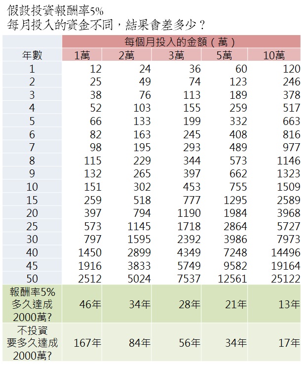 每月只投入 1萬,要 46年才能達成 2000萬。